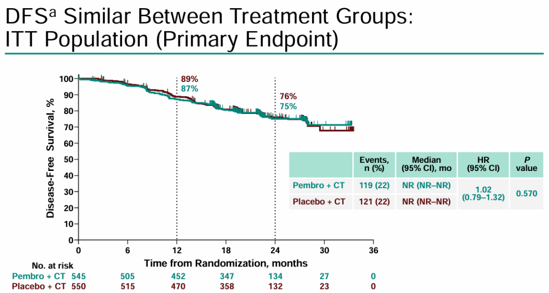 在总体ITT人群中,2年DFS率没有差异,帕博利珠单抗组为75%,安慰剂组为76%(风险比<hr/>=1.02)。