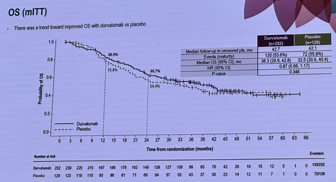 在mITT人群中,度伐利尤单抗组和安慰剂组的中位PFS是14个月vs 6.5个月(HR=0.75,P=0.038),免疫巩固治疗实现了7.5个月PFS延长。我们此次报告研究结果时,总生存(OS)数据还不是很成熟,OS HR为0.83,呈现了获益的倾向。无论患者接受同步或序贯放化疗,度伐利尤单抗巩固治疗均可带来一致PFS获益。