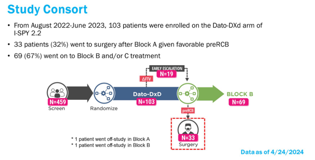 王坤教授:首先,该研究在设计上进行了创新,I-SPY 2.2研究经历了从1.0、2.0到2.2的演化过程,包括三个连续的治疗模块(block A、B和C),其中block A应用Dato+度伐利尤单抗治疗,超过一半的患者获得了pCR,意味着有一半的患者不需要经过化疗+免疫治疗就能达到pCR。