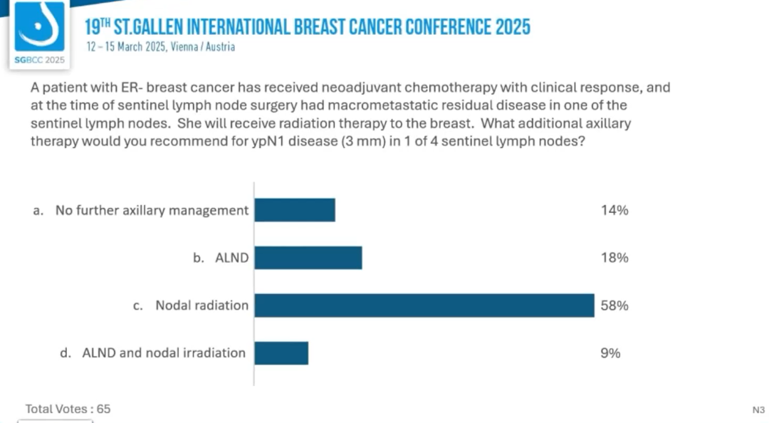(7)某HER2阳性乳腺癌的患者接受了新辅助化疗并有临床反应,在前哨淋巴结手术时发现其中一个前哨淋巴结有巨块型残留病灶。她将接受乳房放疗。针对1/4枚前哨淋巴结的ypN1期疾病(3mm),您会推荐哪种额外的腋窝治疗?
