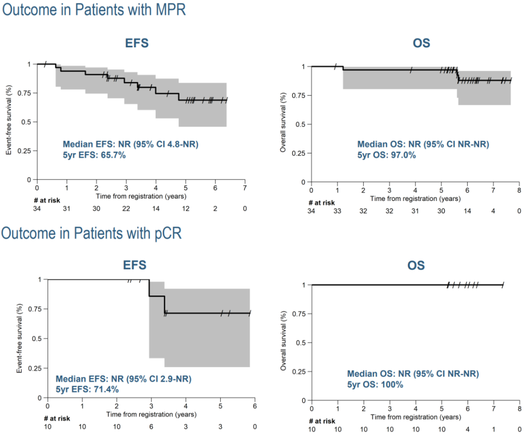SAKK 16/14既往已发表的研究结果显示,该试验达到了1年无事件生存期(EFS)这一主要终点。1年EFS率从早期单纯化疗试验中的约50%提高到本试验的73.4%。我们目前已在巴黎的ELCC大会上公布了最终分析结果,中位随访期为6年。经过6年的中位随访,中位EFS为4年,中位总生存期(OS)尚未达到,病理学完全缓解率(pCR)为18.2%。主要病理缓解(MPR,定义为切除标本中残存活肿瘤细胞≤10%)的发生率超过60%。此外,pCR和MPR是预后的主要预测因素。pCR患者的中位EFS在中位随访6年后仍未达到。