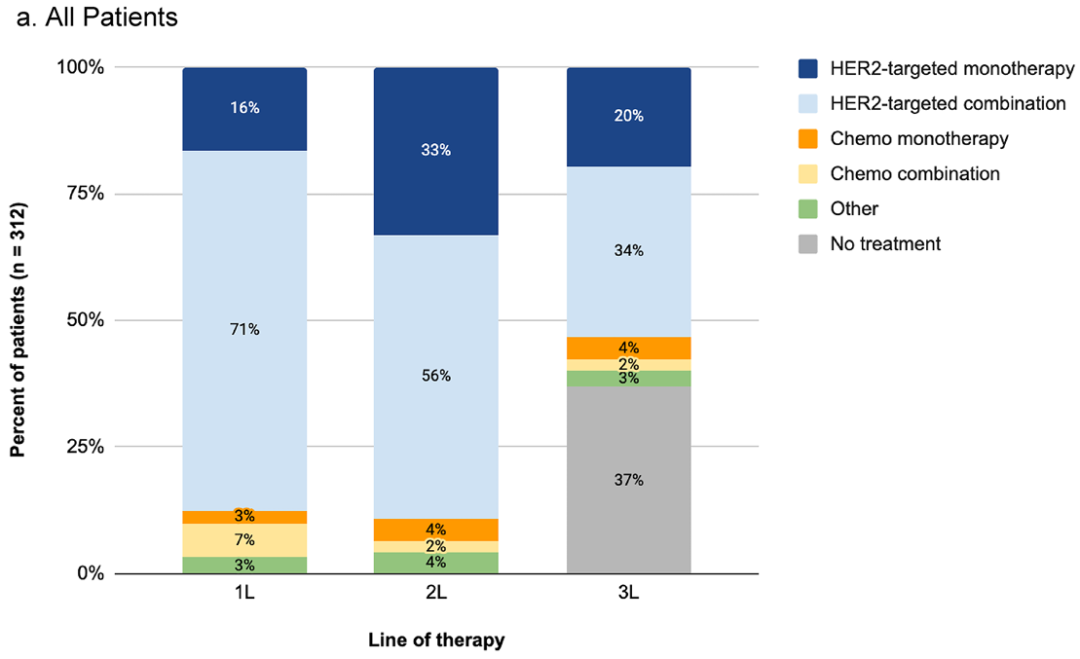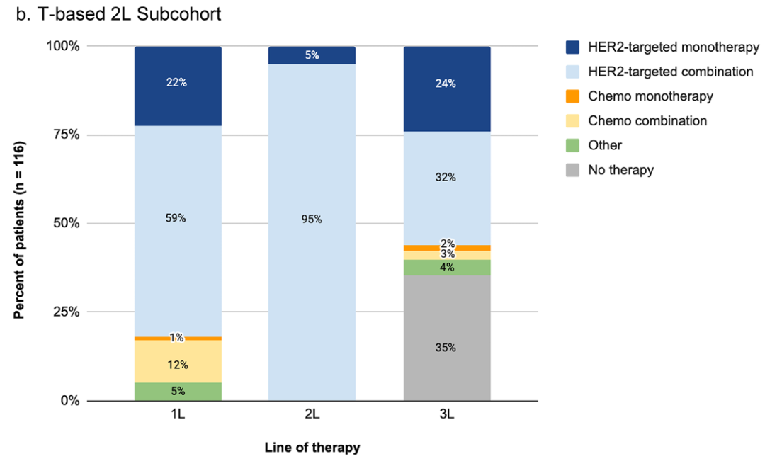 在所有312名患者中,89%的二线治疗为HER2靶向治疗,其中42%接受了含T-DM1的方案,37%接受了基于曲妥珠单抗的方案。最常见的治疗方案依次为联合或不联合内分泌治疗的T-DM1(29%)、曲妥珠单抗+帕妥珠单抗+紫杉烷(10%)以及T-DM1+曲妥珠单抗(8%)。在二线治疗中,20%(64/312)的患者接受了标准的T-DM1单药治疗;然而,另外22%(68/312)的患者同时接受了T-DM1和另一种方案。在基于曲妥珠单抗的二线治疗亚组,最常见的方案分别是曲妥珠单抗+帕妥珠单抗+紫杉烷(28%)、曲妥珠单抗+帕妥珠单抗(11%)以及曲妥珠单抗+拉帕替尼(6%)。二线治疗中43%的患者接受了基于ADC的方案;在HER2靶向单药治疗组的比例为65/103,而在HER2靶向联合治疗组的比例为65/175。