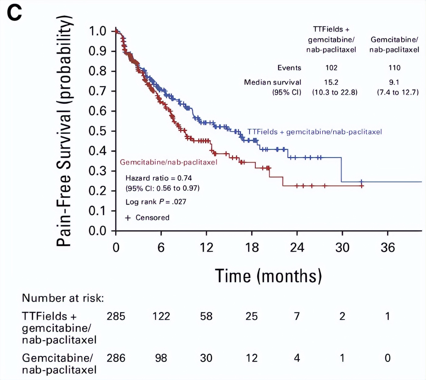 无痛生存期是该研究的重要指标,TTFields联合化疗组的无痛生存期较单纯化疗组延长6个月(15.2个月vs 9.1个月),HR为0.74(95%CI 0.56-0.97),P=0.027,具有显著的临床优势,对常伴复杂疼痛的局部晚期胰腺癌患者具有重要临床价值(图7)。