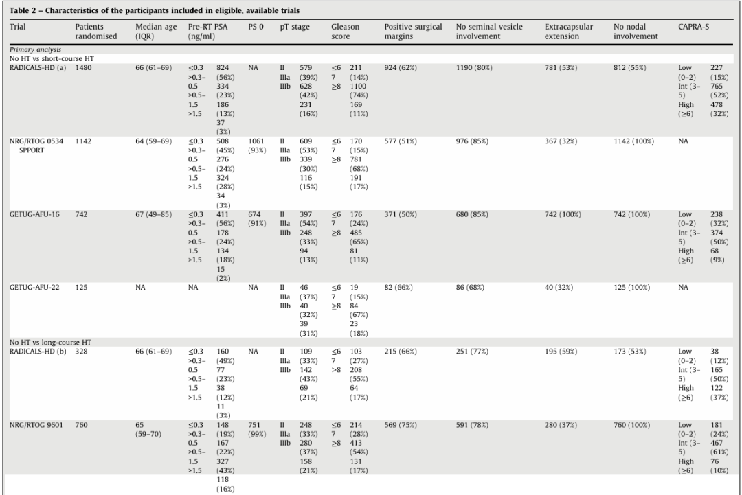 研究共纳入五项已完成的RCT(RADICALS-HD、RTOG 9601、RTOG 0534、GETUG-AFU-16和GETUG-AFU-22)的结果。所有试验的中位随访时间为6.2~13年。研究中的患者分别接受短期内分泌治疗和无内分泌治疗(四项试验对照,3489名患者)或长期内分泌治疗和无内分泌治疗(两项试验对照,1088名患者)。RADICALS-HD研究比较了短期内分泌治疗和长期内分泌治疗(1523名患者),允许进行挽救性放疗或辅助性放疗。其余所有试验均采用了前列腺床挽救性放疗;两项试验还采用了淋巴结放疗。同步内分泌治疗的使用情况因试验而异。