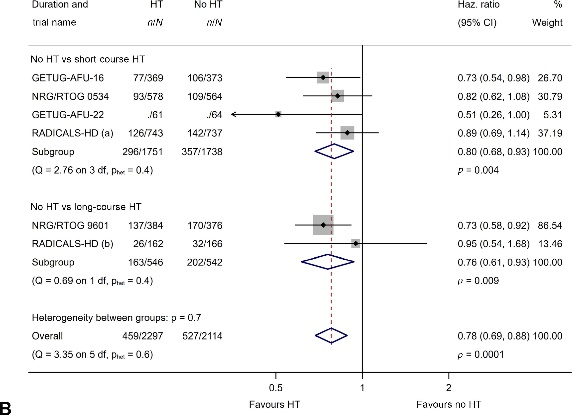 基于4286名患者和247例事件(占所有死亡病例的三分之一),前列腺癌特异性生存(PCSS)的HR为0.61(95%CI=0.47-0.79,P<0.001)。这意味着8年时PCSS的估计绝对改善为4%(95%CI=2%-5%),从90%增至94%。各试验结果大致一致(异质性P=0.5),随机效应模型的结果也相似(HR=0.61,95%CI=0.43–0.87,P=0.02)。短期内分泌治疗(3364名患者,143起事件;HR=0.68,95%CI=0.48–0.96,P=0.03)和长期内分泌治疗(1088名患者,109起事件;HR=0.54,95%CI=0.36–0.80,P=0.002;组间差异检验P=0.4)之间的疗效差异尚无明确证据。