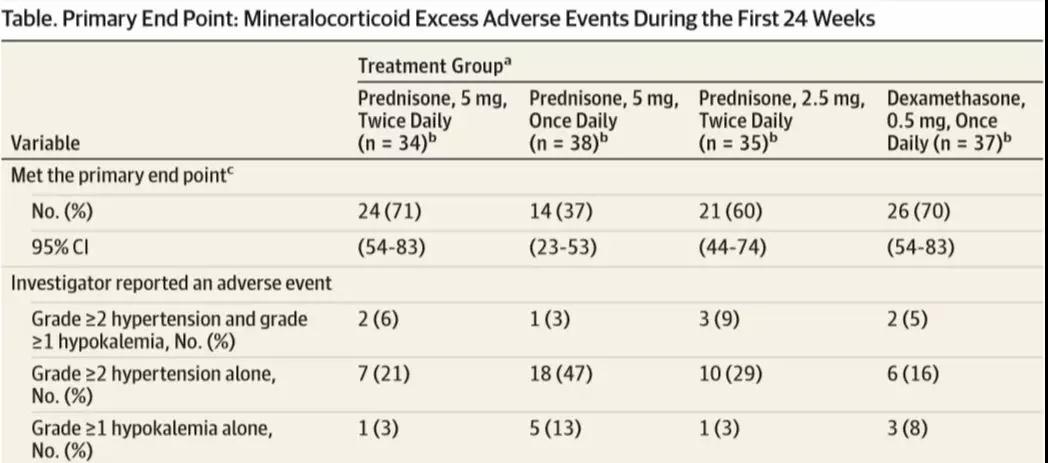 8周后血浆促肾上腺皮质激素和尿盐皮质激素代谢产物含量,强的松2.5mg日二次组和5mg日一次组高于5mg日二次组或地塞米松0.5mg日一次组。无论糖皮质激素治疗方案如何,未达到主要终点的患者的尿糖皮质激素代谢产物水平均较高。强的松组瘦体重(LBM)患者总数减少,强的松5 mg日二次和地塞米松组患者总体脂增加。