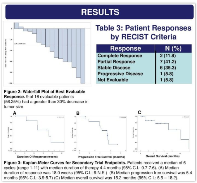14例患者出现肿瘤缩小,9例患者达到ORR(56.25%; 95% CI[30-80%]);2例患者CR, 7例患者有部分缓解(PR),经过中位5.1 个月的随访,中位DOR为18周(95% CI: 6-NR),中位PFS为5.4个月(95% CI: 3.9-5.7),中位OS为15.2个月(95% CI: 5.5-18.2)。患者接受中位6个周期(范围1-11)治疗,中位DOT 为4.4个月(0.7-7.6)。