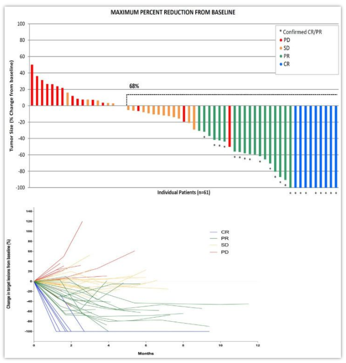 结果:2019年1月~9月之间,PEANUT纳入了63例可评估患者:24%女性,中位年龄69岁(范围61-73);纳入75%一线全身治疗失败的患者,25%二线治疗失败的患者;35%为ECOG-PS评分为1;33%有肝转移。TMB中值为6.9 mut/Mb。