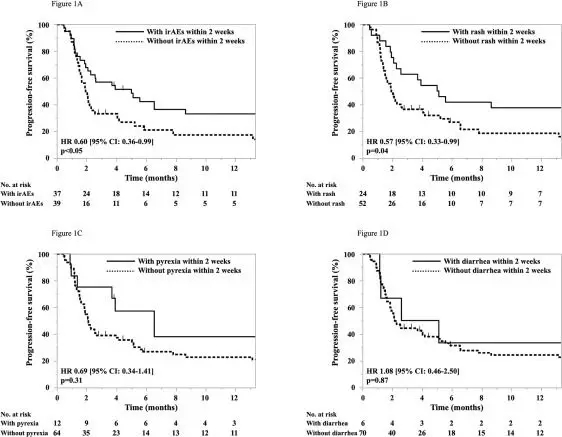 图1. 整体不良反应(A)及皮疹(B)、发热(C)及腹泻(D)与疗效的相关性