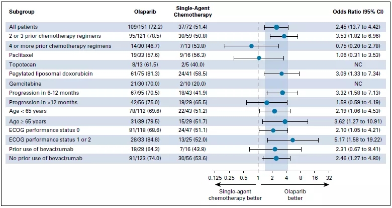 在先前接受过2线化疗患者中,84.6%(66/78)奥拉帕尼组患者缓解,61.5%(24/39)化疗组患者缓解(OR=3.44,95%CI: 1.42-8.54);在先前至少接受过3线化疗患者中,奥拉帕尼组缓解率为58.9%(43/73),化疗组缓解率为39.4%(13/33)(OR=2.21,95%CI: 0.96-5.2)。脂质体阿霉素亚组ORR为58.5%,紫杉醇亚组ORR为56.3%,吉西他滨亚组ORR为20%,拓扑替康亚组ORR为40%(图2)。