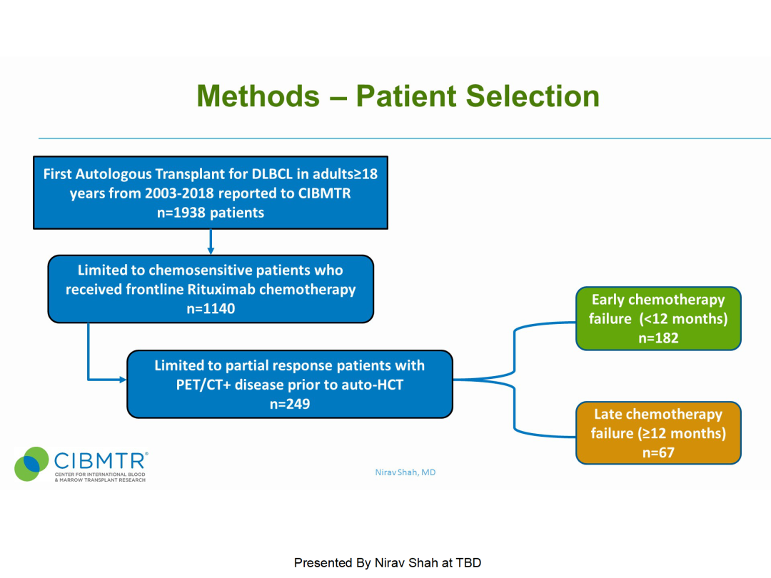 自体造血干细胞移植(autoHCT)巩固治疗是化疗敏感的复发性DLBCL患者的标准治疗。自2017年以来,随着抗CD19 CAR-T细胞治疗的临床获批,挽救治疗后PET/CT显示依然有肿瘤残留的复发性DLBCL患者越来越多地选择接受CAR-T细胞治疗。据2018年国际血液和骨髓移植研究中心(CIBMTR)的数据显示,在美国,接受autoHCT的DLBCL患者数量较往年减少了约45%。这一现象背后可能的原因是,二线挽救治疗后未达完全缓解的难治性和化疗敏感型DLBCL均接受了CAR-T细胞治疗。通过分析CIBMTR数据库,我们报告了移植之前PET/CT+ PR的对化疗敏感的复发的DLBCL患者,autoHCT的治疗效果