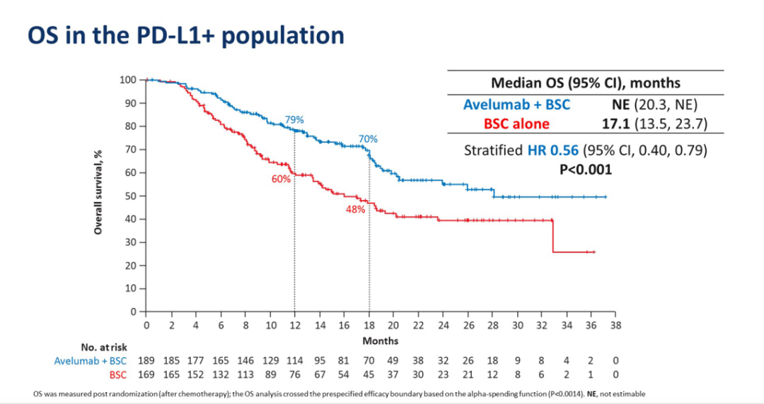 这项研究共入组了700例患者。相较于单独的最佳支持治疗(BSC),阿维鲁单抗+BSC维持治疗可显著可显著降低31%的死亡风险(OS:21.4 vs 14.3个月;HR 0.69;95%CI 0.56~0.86;P=0.0005)。PD-L1阳性的亚组患者OS也可显著获益(NR vs 17.1个月;HR 0.56;95%CI 0.40~0.79;P=0.0003);对于不同年龄和ECOG评分、不同化疗方案、是否存在内脏转移、不同肾功能(CrCl≥或<60mL/min)等不同亚组均可以看到OS获益趋势。在药物安全方面,绝大多数患者表现良好,仅有12%的患者因不良事件而中断用药。
