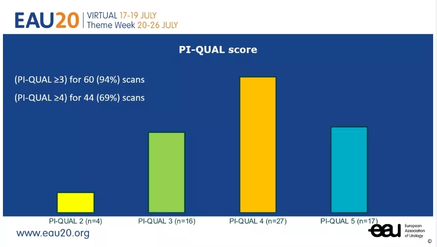 PRECISION研究是一项国际多中心、前瞻性、优效性假设临床试验,对比MRI引导穿刺与TRUS引导穿刺的准确性。在该研究中建立的PI-QUAL评分(Prostate Imaging Quality)基于mpMRI质量,分为1分:无MRI序列具有诊断价值;2分:只有一个MRI序列具备诊断价值;3分:可以进行评分,但无法识别典型病变;4分:2/3的MRI序列具备诊断价值,可诊断或排除病变;5分:任一MRI序列均具备诊断价值。达到PI-QUAL≥4分的MRI扫描仅占69%(图1),其中最难达到标准的序列为DCE序列。