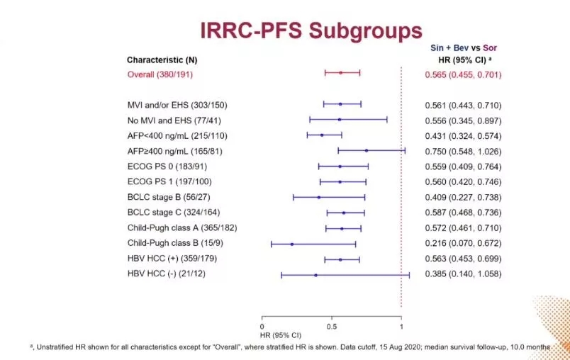 同样,改善的PFS也得到了证实,按照RECIST v1.1标准经IRRC评估的进展风险在联合治疗组降低了43.5%;联合治疗组的平均PFS为4.6个月,索拉非尼组平均PFS为2.8个月(HR=0.565;95%CI:0.455~0.701;P<0.0001)(图4)。