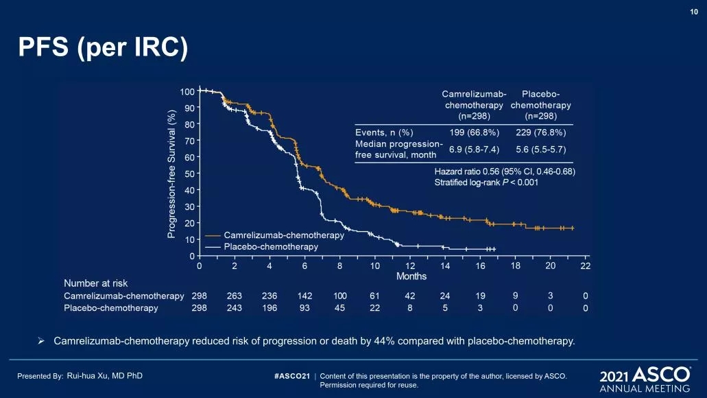 结果:从2018年12月3日至2020年5月12日,596例患者被随机分组。298例接受卡瑞利珠单抗联合化疗,297例接受安慰剂联合化疗。中位随访10.8个月,与安慰剂联合化疗相比,卡瑞利珠单抗联合化疗显著改善OS(中位15.3个月[95%CI:12.8~17.3] vs. 12.0个月[11.0~13.3];HR 0.70 [95%CI:0.56~0.88];单侧P=0.0010)和PFS(根据IRC)(中位,6.9个月[95%CI:5.8~7.4] vs. 5.6个月[95%CI:5.5~5.7];HR 0.56 [95%CI:0.46~0.68];P<0.0001)(图1,图2)。经研究者评估的ORR在卡瑞利珠单抗联合化疗组为72.1%,在安慰剂联合化疗组为62.1%,中位DoR为7.0个月 vs. 4.6个月。两组间≥3级治疗相关AEs的发生率相当(63.4% vs. 67.7%),其中最常见的是中性粒细胞计数下降(39.9% vs. 43.4%)。严重的治疗相关不良事件分别发生在30.2% vs. 23.2%的患者,治疗相关死亡分别发生在3.0% vs. 3.7%的患者。