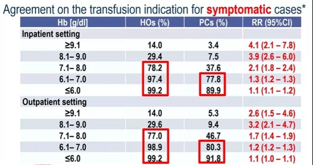 对于无症状的住院患者,超过70%的血液病医生认为输血指征是Hb<6.0 g/dL,但只有41.4%的姑息治疗医生认同这一输血指征。