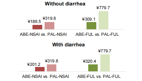 • 即使将1-2级的腹泻也纳入进行粗略的估计,结果也几乎保持不变,原因在于用于治疗1-2级腹泻的止泻药(例如洛哌丁胺)的价格非常低。