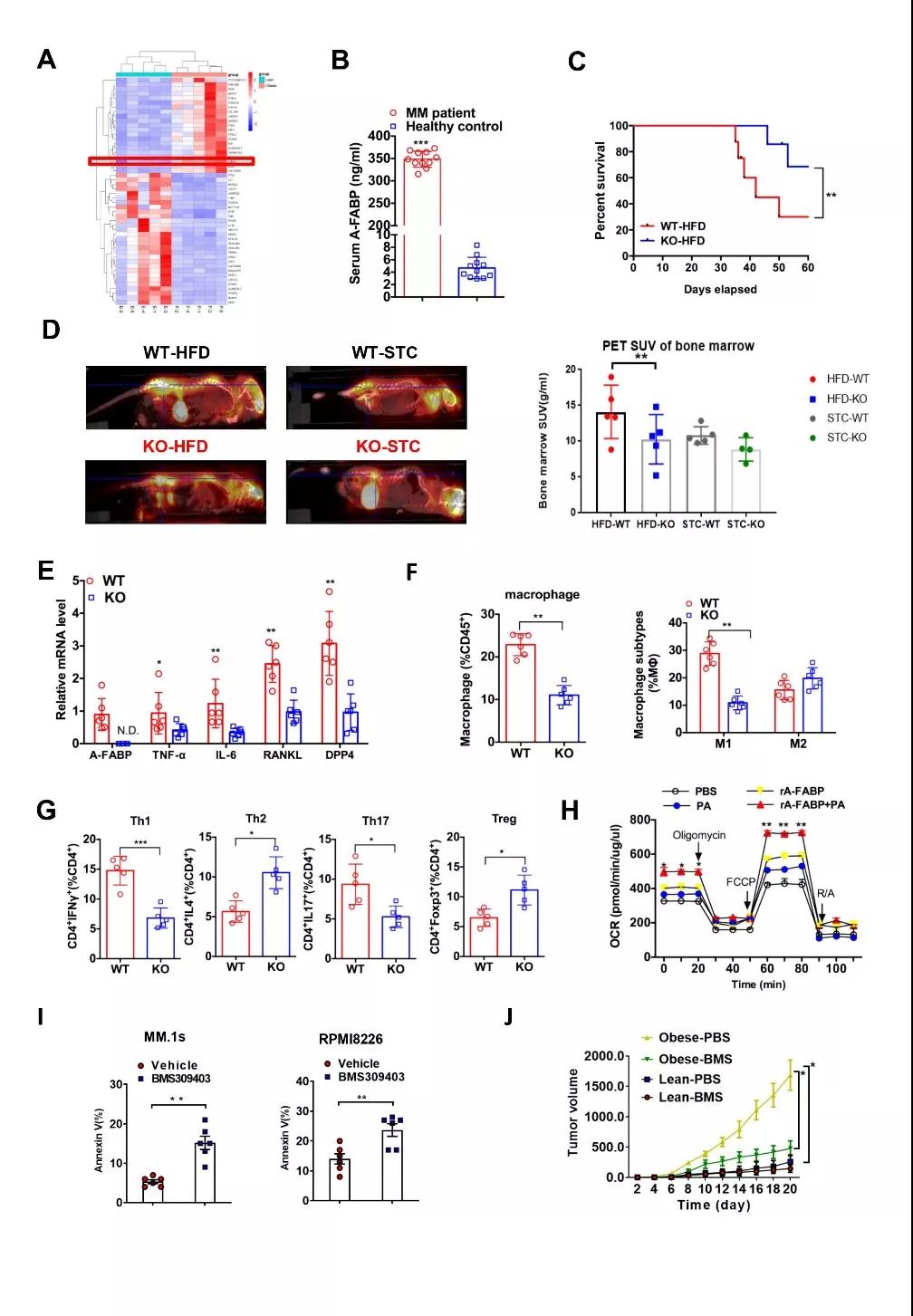 图C&D、FABP4缺乏可显著减轻HFD喂养小鼠的肿瘤负担和MM相关的溶骨性病变;