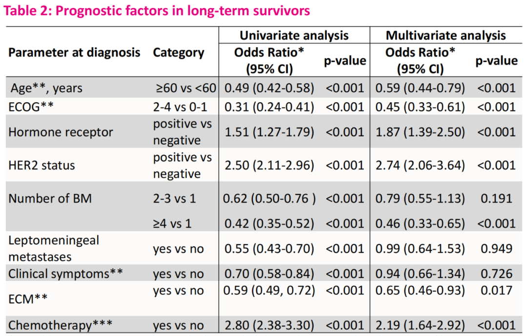 长期生存者的中位OS为30.9个月(95%CI:28.8~32.6),其中HER2+、Luminal型、TNBC分别为33.9个月、26.9个月和26.5个月。在单因素和多因素分析中,年龄、HR状态、HER2状态、脑转移数量、颅外转移、化疗均与长期生存显著相关。