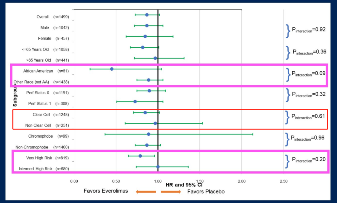 Dr.Ryan:我也是这么想的。EVEREST研究中大约约17%的患者为nccRCC。我们也进行了亚组分析,遗憾的是结果也并没有显示更好,在森林图中可以看到,ccRCC和nccRCC患者的RFS HR并没有显著差异(P=0.61),但其实这部分患者的数量较少,所得到的置信区间非常宽。我们知道嫌色细胞肾癌患者往往存在mTOR通路失调,我认为理论上这类人群应该是可以看到获益的。但这些研究样本太小,还不足以证明。
