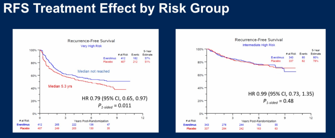 该研究的主要终点是无复发生存(RFS)。事件比我们预期的要少,但我们发现接受依维莫司治疗的患者在无复发生存率方面有改善,相较于安慰剂组的危险比(HR)为0.85,但没有达到统计学意义,单侧P值为0.25,而研究预设的显著性阈值为P=0.22。但在极高危组(pT3a G3-4至pT4 G-any或N+)患者中,我们可以看到依维莫司的RFS显著改善,HR为0.79,单侧P值0.11;对于中危患者则没有获益(HR 0.99,P=0.48)。我们的结果表明,依维莫司用于肾癌辅助治疗是有临床意义的,尽管没有达到显著意义的P值,但在极高危患者中是有显著获益的。
