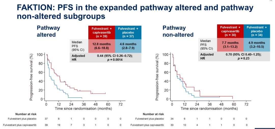 ITT人群的PFS数据与此前相同(10.3 vs 4.8个月),但HR更新为0.56(95%CI:0.38~0.81;P=0.002)。值得注意的是,采用NGS增加检测位点后,PI3K/AKT/PTEN通路对PFS有影响:PA患者中Capivasertib组和氟维司群组的PFS分别为12.8个月和4.6个月(HR 0.44,95%CI:0.26~0.72;P=0.001);而PNA患者中分别为7.7和4.9个月(HR 0.70,95%CI:0.40~1.25;P=0.23)。