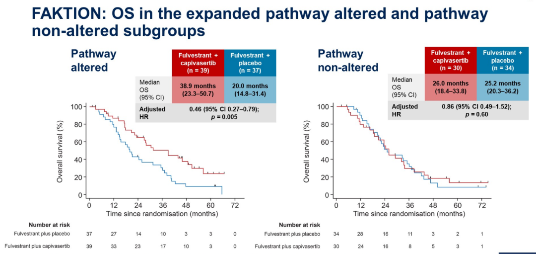 此次报告的OS结果显示,虽然ITT人群两组间OS没有显著差异,但Capivasertib组仍延长了将近半年,尤其是PIK3CA/AKT/PTEN通路异常患者的OS显著延长了19个月,死亡风险降低54%。FAKTION研究的成功填补了AKT抑制剂靶向治疗的空白。在晚期耐药乳腺癌精准检测引导精准治疗的路上,为患者提供了一种新的选择。