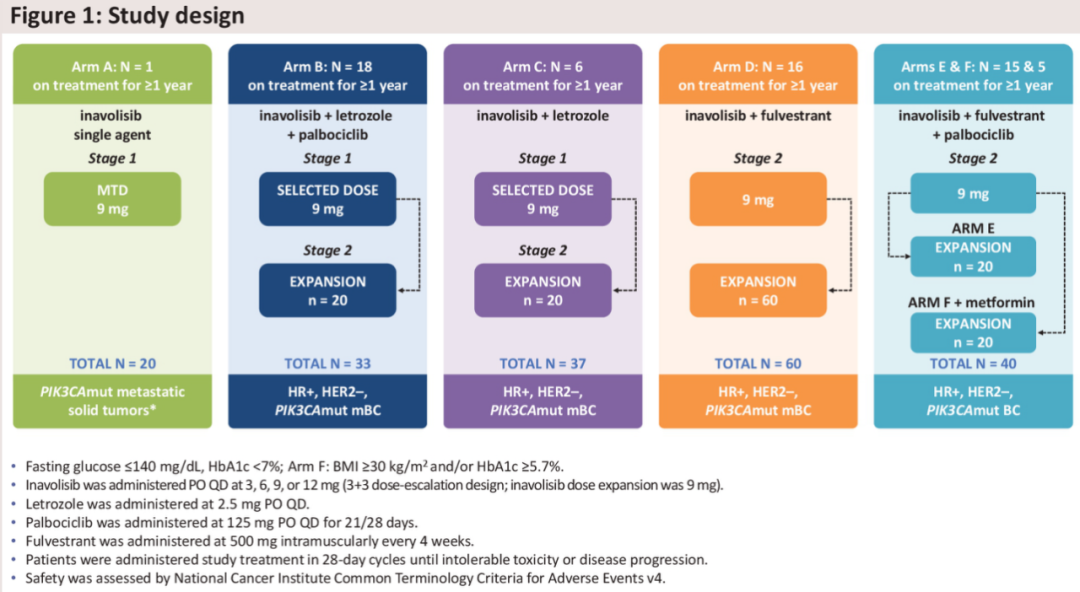 研究方法:研究(NCT03006172)纳入接受含Inavolisib治疗≥1年的患者,组别分别为:单用Inavolisib(A组);Inavolisib联合哌柏西利+来曲唑(B组);Inavolisib联合来曲唑(C组);Inavolisib联合氟维司群(D组);Inavolisib联合哌柏西利+氟维司群(E组),Inavolisib联合哌柏西利+氟维司群+二甲双胍(F组:体重指数≥30和/或HbA1c≥5.7%)。给药剂量:Inavolisib 3mg、6mg、9mg或12mg,口服、日1次 (3+3剂量递增设计);来曲唑2.5mg,口服,日1次;哌柏西利125mg,口服,日1次,第1-21天,停药7天;氟维司群:500mg,肌肉注射,4周1次,用药直至毒性不可耐受或疾病进展。按照NCI-CTCAE v4进行安全性评估。
