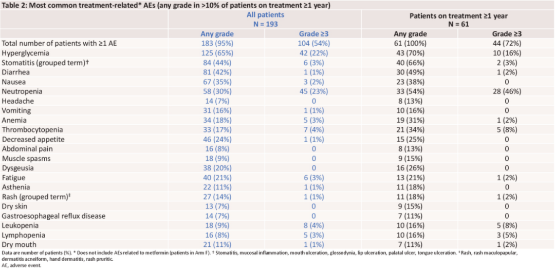 3-4级中性粒细胞减少、白细胞减少、血小板减少和淋巴细胞减少均在哌柏西利组。5级胸腔积液(与疾病进展相关)1例。因研究中39例(68%)出现≥1级AE,导致治疗改变,包括停药、减量、终止治疗,其中11例(19%)Inavolisib减量、2例(4%)因AE终止治疗(1例治疗相关的2级腹泻,1例不相关的3级脑血管疾病)。
