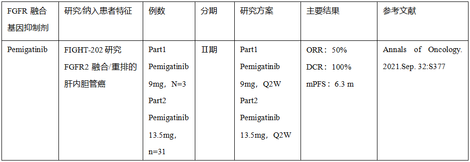在Ⅱ级推荐中,有两类药物推荐。第一类是针对成纤维细胞生长因子受体(Fibroblast growth factor receptor,FGFR)融合基因的多个抑制剂临床研究结果发表,虽然尚未获得NMPA批准上市,但作为晚期iCCA的重要研究进展和该类药物在治疗中的地位,仍然做了推荐(见附表)。目前共有5种FGFR1-3(4)特异性和选择性抑制剂,其中Futibatinib属于不可逆抑制剂。由于至今有关这类药物的临床研究均是Ⅱ期结果,纳入的患者的数量有限、FGFR1-4融合基因检测方法的不统一性等,其ORR为20.7%~50.0%,mPFS为5.7~7.3个月,FIGHT202研究报道了Pemigatinib的mOS为21.1个月。该类药物的主要不良反应为高磷血症、腹泻和口干等,耐受性良好。其中Pemigatinib由Ⅲ级推荐改为Ⅱ级推荐。
