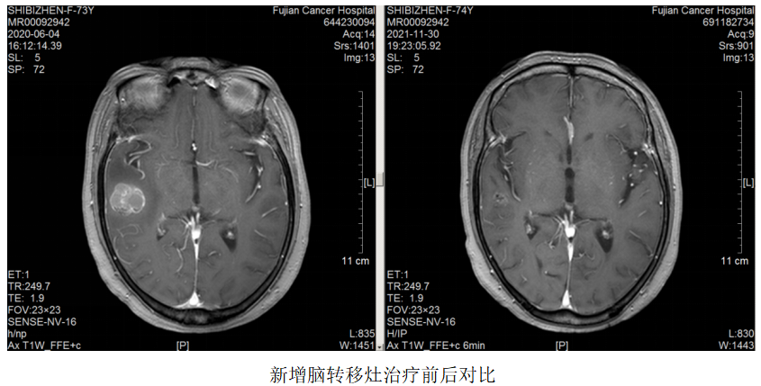 再次放疗:2020.06.04复查颅脑MR:原左侧额、枕叶脑转移瘤较前缩小,右侧颞叶新增转移瘤,于2020.6.15-6.26予脑转移灶调强放疗DT3000CGy/10F。