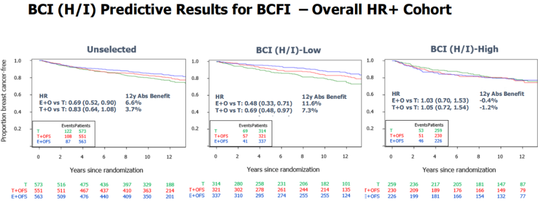 研究结果:该研究共纳入1678例患者,进行了长达12年的随访,评估BCI在OFS+TAM或OFS+AI与单纯TAM组对比中能否预测OFS的获益。研究者假定BCI评分可以作为N0或N1患者的预后因子,并且BCI-High是OFS获益的预测因子,而BCI-Low人群不能从OFS联合使用中进一步获益。主要终点为乳腺癌无癌间期(BCFI)。次要终点为远处无复发间隔期(DRFI)和无病生存期(DFS)。