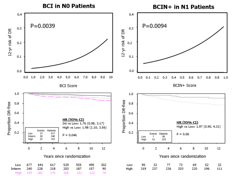 首先,研究者证实了BCI score无论是在N0或N1人群中,较高的评分均和远处复发存在正相关。BCI是绝经前女性HR+癌症的预后指标。