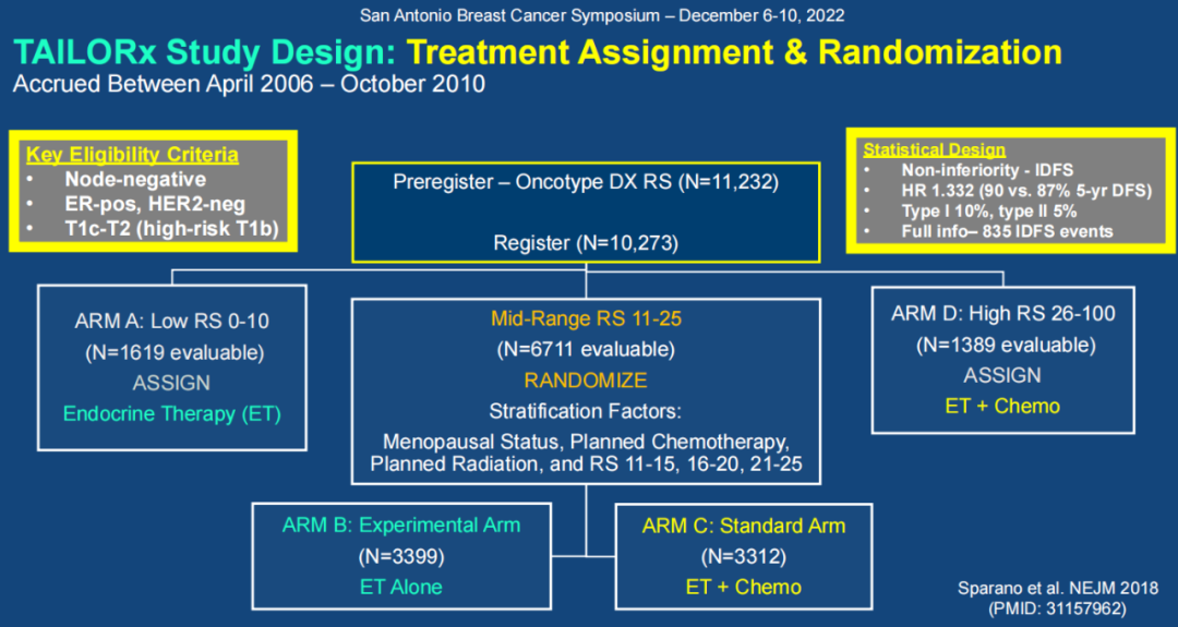 研究背景:在激素受体(HR)阳性的早期乳腺癌(EBC)中,5年远处复发约占所有复发风险的50%。TAILORx研究的既往结果表明针对21基因复发评分(RS)为11-25的EBC患者,至少5年的辅助内分泌治疗(ET)非劣于化疗加ET(CET)的辅助治疗(ET),尽管部分女性接受化疗显示出了一定的获益。