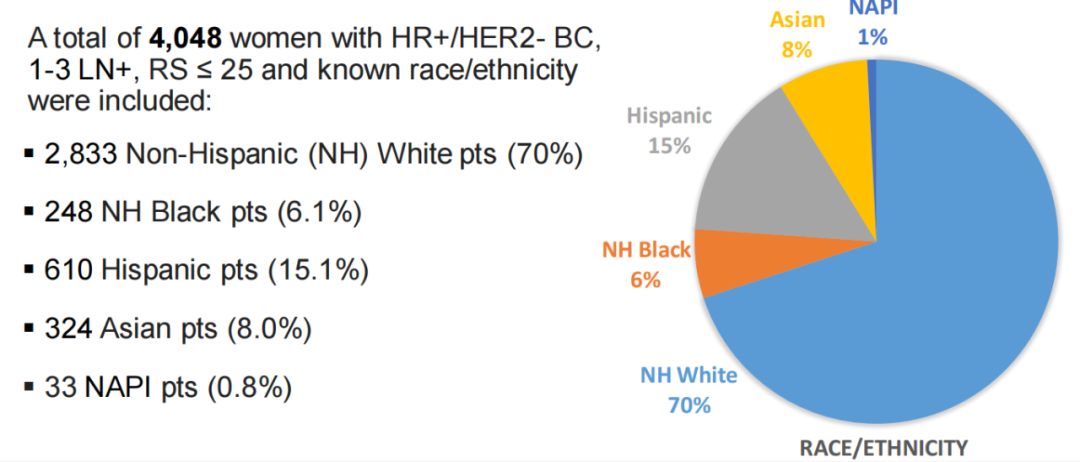 我们了解到,乳腺癌患者中不同人种对于预后的影响不可忽视,在美国黑人的发病率较白人低4%,但是乳腺癌导致的死亡却增加了40%,并且这一结论在调整了非生物因素的影响后依旧存在。基于此,本次大会上进一步更新了RxPONDER研究中不同人种的生存差异。