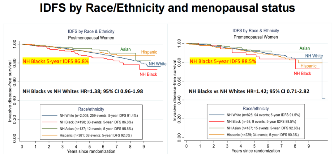 生存数据上,5年的iDFS数据中,非西班牙裔黑人最差仅为87.2%,而亚裔、非西班牙裔白人和西班牙裔这一数据分别为93.9%、91.5%和91.4%。
