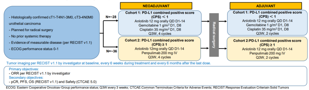 在本次2023年美国临床肿瘤学会(ASCO)年会上,由复旦大学附属肿瘤叶定伟教授、张海梁教授和朱一平教授牵头发起的ALTER-UC-007研究入选大会壁报[20]。该研究是一项安罗替尼联合吉西他滨/顺铂或安罗替尼联合派安普利单抗围术期治疗局部晚期尿路上皮癌的前瞻性II期研究(ChiCTR2200063085)。主要入组标准为:年龄18-75岁;组织学确诊的临床分期(c)T1-T4N1-3M0,T3-4N0M0尿路上皮癌(膀胱,肾盂,输尿管和尿道肿瘤)适合并计划进行根治性膀胱切除术,肾输尿管切除术或输尿管切除术;既往未接受过T细胞共刺激或免疫检查点抑制剂治疗史;既往未接受过化疗、小分子靶向药物治疗或放疗;ECOG评分0-1。根据PD-L1表达水平分为2个队列。队列1,PD-L1表达阴性患者将接受安罗替尼(12 mg,po,qd,d1-14,q3w)+吉西他滨(1000 mg/m2,iv,d1,d8)+顺铂(35 mg/m2,iv,d1,d8)新辅助治疗,共4个周期,随后接受根治性手术,术后接受2个周期的辅助治疗,治疗方案同术前新辅助。队列2,PD-L1表达阳性患者将接受安罗替尼(12 mg,po,qd,d1-14,q3w)+派安普利单抗(200 mg/m2,iv,q3w)新辅助治疗,共4个周期,随后接受根治性手术,术后接受2个周期的辅助治疗,治疗方案同术前新辅助。研究治疗完成或中止后,将进行安全性随访和生存随访。分别于基线期、治疗期每6周、随访期每6个月进行一次肿瘤影像学评估,直至2年。主要终点为ORR。次要终点包括pCR、DFS、OS和安全性。目前研究正在入组中。