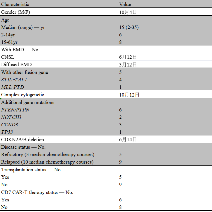 我们发现了14例t(8;14)(q24.1;q11.2)异位的患者(发病率1.9%),所有患者都是难治或复发患者,其中5例为原发难治,9例在复发时发现t(8;14)(q24.1;q11.2)异位。4名患者同时存在STIL::TAL1异位,6名患者存在PTEN突变,6名患者发现CDKN2A/B基因缺失。9例患者有髓外侵犯。治疗上,7例患者仅接受化疗或异基因造血干细胞移植(Allo-HSCT)的患者全部死亡,中位总生存期(OS)仅为3个月(范围:2-7个月)。但是自2020年10月起,我院开展CD7 CAR-T治疗难治或复发T-ALL/LBL的临床试验后,6名患者接受了CD7 CAR-T治疗,5例患者在第30天获得完全缓解(CR),其中三例达到微小残留病灶(MRD)阴性状态,但有两例患者CAR-T治疗后30天MRD再次转阳。四例在CAR-T后桥接到Allo-HSCT的患者迄今为止仍然无病存活。
