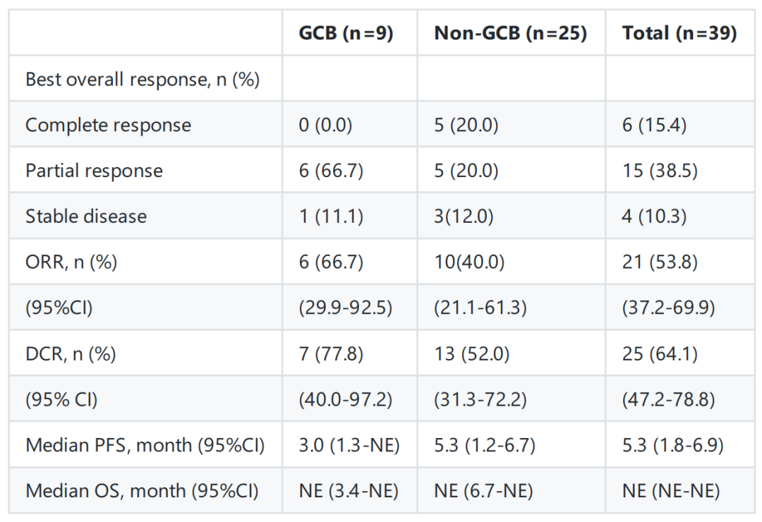 截至2021年10月11日,中国的6个医学中心共入组39例R/R DLBCL患者,其中生发中心B细胞样(GCB)亚型9例,non-GCB亚型25例,5例患者因缺乏足够资料而未能进行有效评估,认定为缺失。中位年龄58岁,65岁以上患者28.2%,男性64.1%,既往治疗中位数为2,两个亚型之间的基线特征无差异。