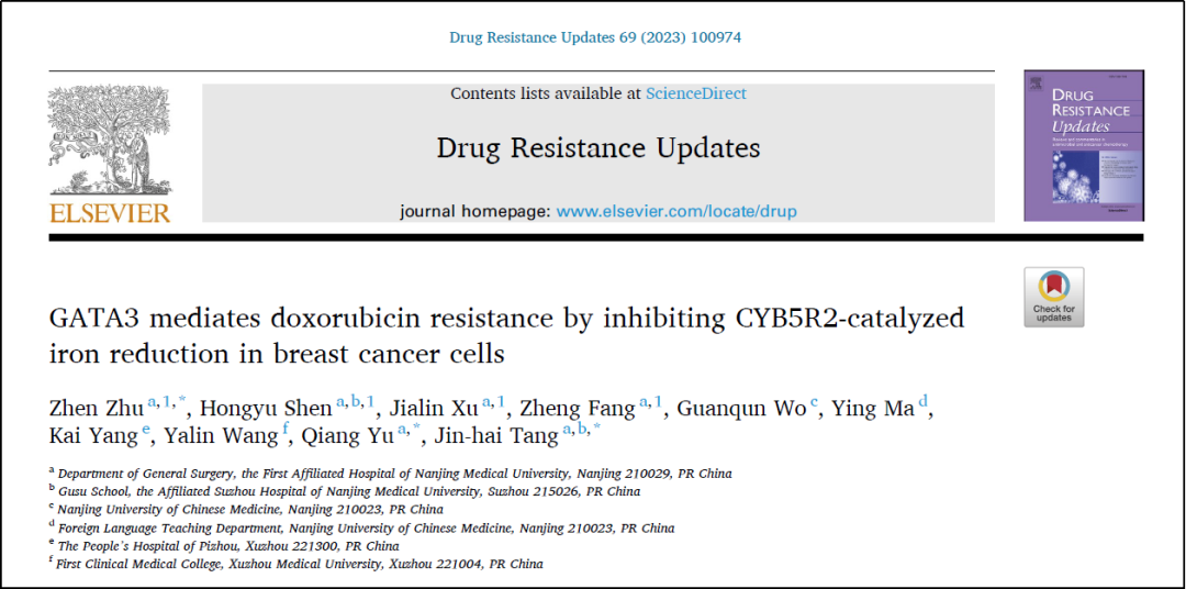 乳腺癌是女性中发病率最高的肿瘤,其中luminal型(包括luminal A型和luminal B型)占比达70%。新辅助化疗是乳腺癌主要的术前治疗手段之一,为患者增加了手术机会。新辅助化疗敏感的患者术后预后更好,复发风险更低(Chen et al.,2004;Spring et al.,2020)。然而luminal型乳腺癌患者新辅助化疗后病理完全缓解率仅有大约10%(Cortazar et al.,2014),解析该型患者新辅助化疗耐药机制具有重要的临床意义。江苏省人民医院唐金海教授团队最新发现luminal型乳腺癌内的关键基因GATA3过表达可以抑制阿霉素在肿瘤细胞内的还原态过载,从而导致肿瘤细胞的凋亡和铁死亡减少,导致阿霉素耐药。相关学术成果日前被Drug resistance updates接收(IF=24.3),已于Drug resistance updates官网在线发表。