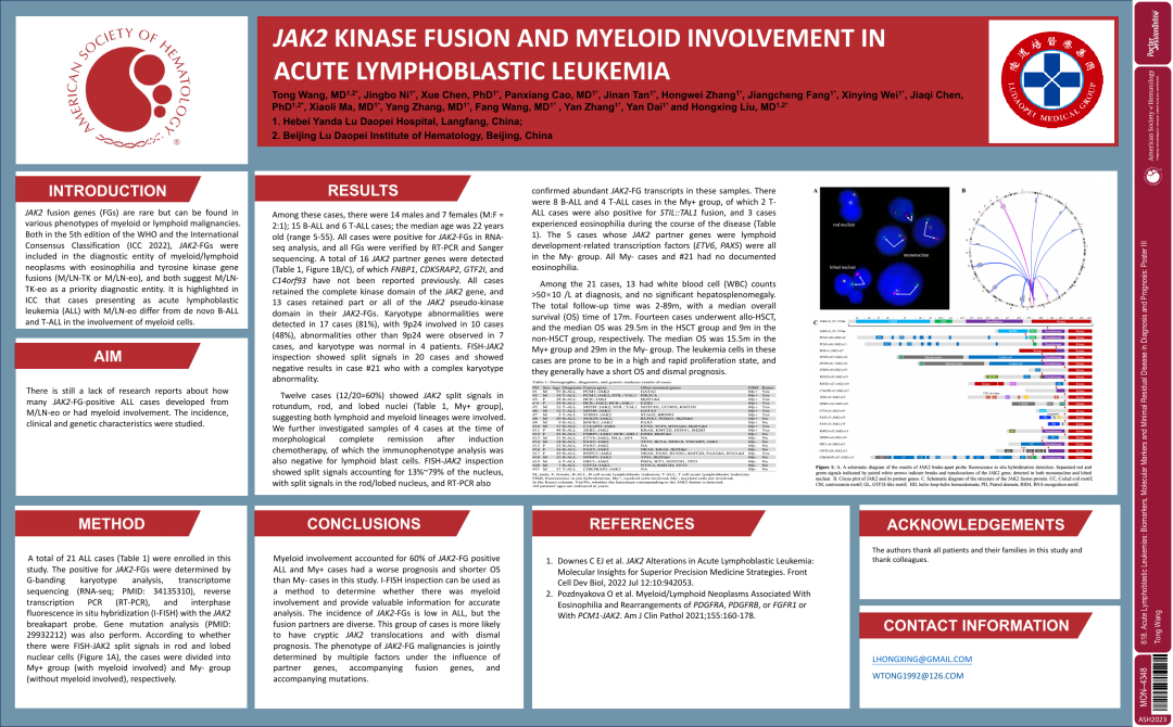 2023年第65届美国血液学会(ASH)年会已圆满闭幕。作为全球血液病领域的权威学术盛会,ASH年会上呈现的学术报告代表了血液病领域的最重要及前沿的研究成果。在本次大会上,河北燕达陆道培医院、北京陆道培血液病研究院王彤教授的一项研究入选壁报展示,该研究探讨了急性淋巴细胞白血病(ALL)JAK2基因重排产生融合基因(FGs)及髓系累及情况,以促进临床对JAK2-FGs阳性ALL的临床特点、治疗和预后等的深入认识。