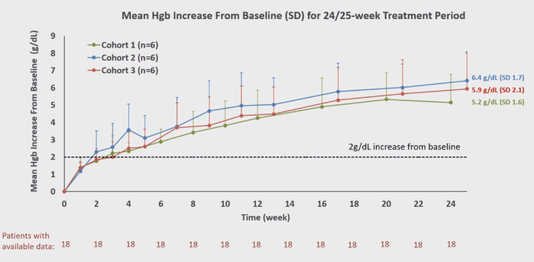 在24/25周治疗期间,患者的血红蛋白水平出现了快速和持续的改善:100%(18/18)患者达到了增加≥2 g/dL的水平(图2),56%(10/18)达到了血红蛋白正常化(≥12 g/dL),而其余的患者接近正常水平;队列1、2和3的血红蛋白平均水平为11.7 g/dL(SD 1.0)、14.2 g/dL(SD 1.9)和12.5 g/dL(SD 1.9)(图3)。
