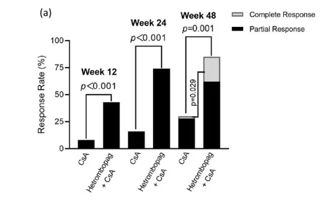 治疗24周时,海曲泊帕联合CsA组的ORR为74%,CsA单药组为16%[优势比(OR):14.7;95%置信区间(CI):4.1~52.4;P<0.001)。海曲泊帕联合CsA组12周和48周的总反应率也显著高于CsA组(43%vs.8%,OR:9.1,95%Cl:2.7~31.1,P<0.001;85%vs.30%,OR:13.0,95%Cl:2.5~66.2,P=0.001)。治疗48周时,两组的完全反应率分别为23%和2%(OR:13.8;95%Cl:1.3~146.8;P=0.029)。