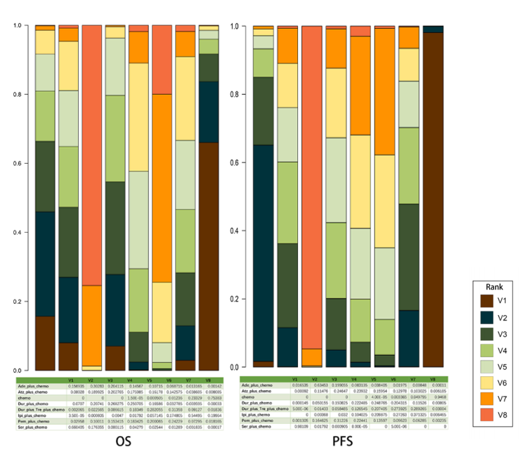 基于疗效和安全性的贝叶斯排名概率分析显示,斯鲁利单抗+化疗对OS贡献排名第一的累积概率为64%,对PFS贡献排名第一的累积概率为98%,对ES-SCLC患者呈现最佳生存获益的可能性最大。