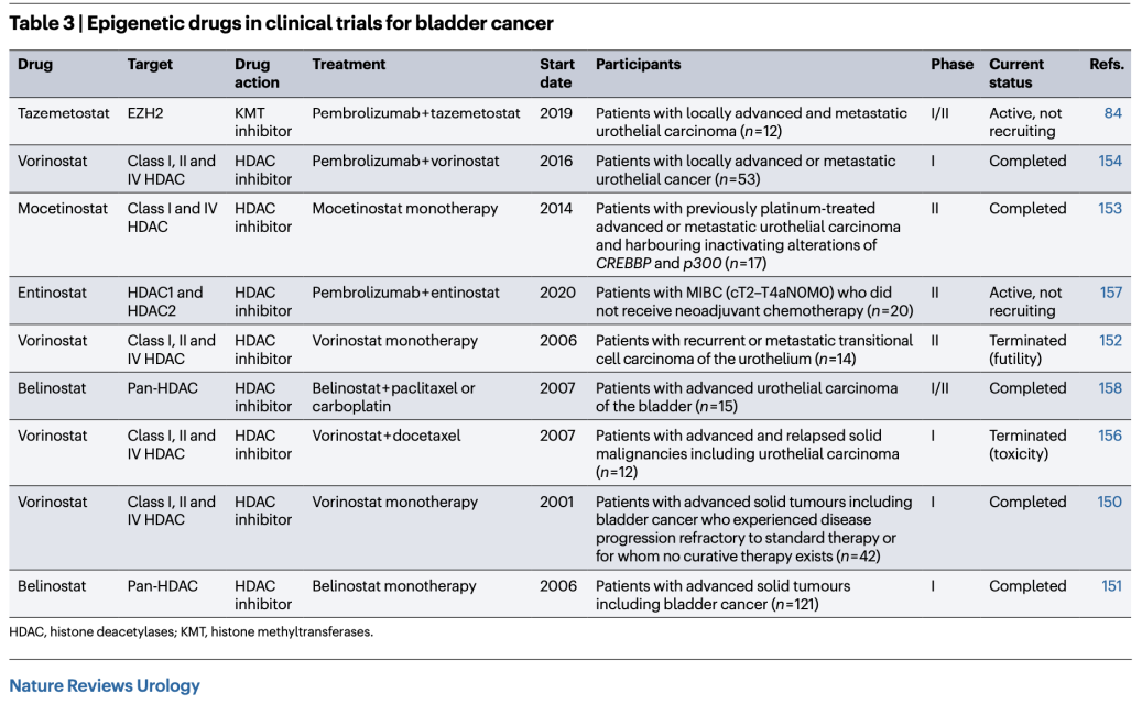 目前,仅少数小分子化合物进入临床试验且多数处于I/II期阶段。HDAC抑制剂是目前在膀胱癌临床试验中研究最多的表观药物,在局部晚期或者转移性膀胱癌患者中,表观单药治疗策略收效甚微且毒副反应较大。基于临床前研究,靶向组蛋白修饰因子对肿瘤免疫微环境具有调节作用,且表观药物联合免疫治疗在许多临床前膀胱癌模型中取得了显著的治疗效果,数个临床试验因此发起,初步结果提示多数病人对治疗响应且耐受。因此,与经典疗法(化疗、免疫治疗等)联合应用或成为更好的治疗策略。