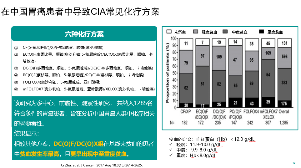 胃癌是我国最常见的恶性肿瘤之一,年新发、死亡患者数均位居全国第三,其中大多数患者发现即为晚期,总体5年生存率不足50%[1,2]。胃癌的治疗与患者的分期、分型密切相关,化疗作为基石治疗手段之一发挥着重要作用,即便选择靶向或免疫治疗,也会联合相应的化疗药物以提升抗肿瘤作用[3]。然而,化疗药物在治疗胃癌的同时,会带来贫血等不良反应。有研究显示胃癌常见的化疗方案CIA发生率为89.8%,中重度CIA的发生率约为43%,其中以DCF/DCX总体贫血发生率最高,接近92%[4]