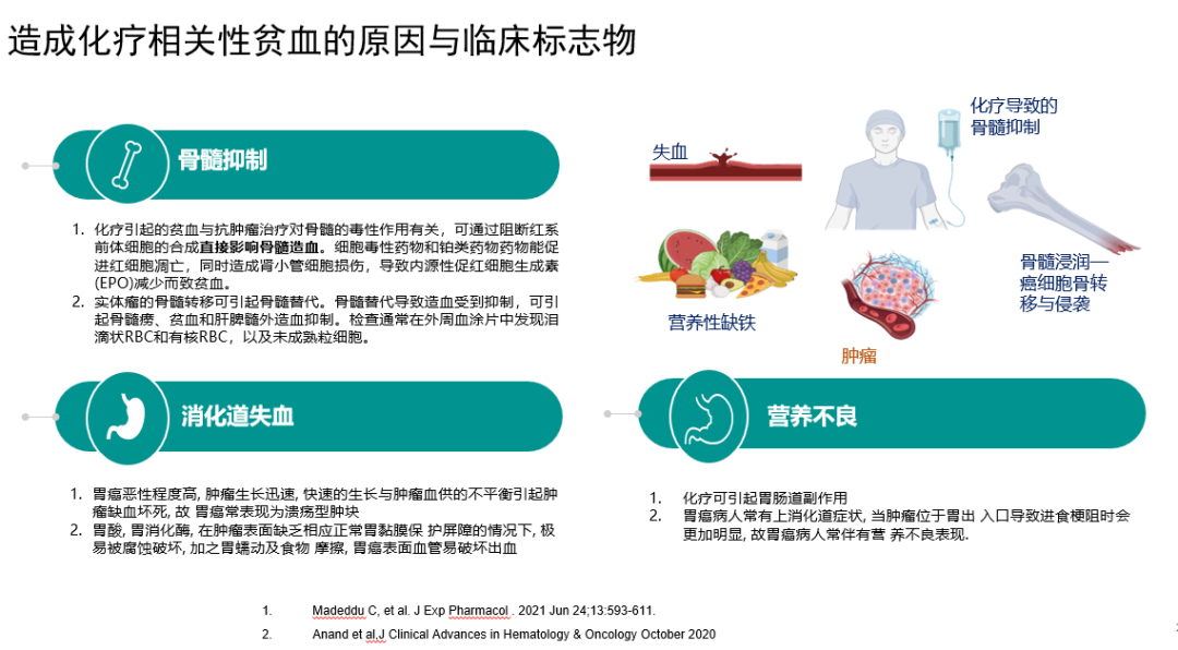 肿瘤患者发生贫血的原因很多,首当其冲的就是各种因素引起的骨髓抑制,一方面化疗会促使进红细胞凋亡、造成肾小管损伤,从而使得人体内促红细胞生成素(EPO)生产不足而贫血,另一方面实体瘤的骨髓转移会引起骨髓替代,抑制骨髓造血功能而诱发贫血。其次是消化道失血,肿瘤的快速生长与难以为继的血供平衡会导致肿瘤坏死、破溃、出血;胃癌组织结构改变,缺乏黏膜覆盖,容易在胃酸、消化酶等的作用下破溃,也会造成出血。再次,化疗引起的消化道毒性会导致患者食欲减退,引起营养不良,使患者体内红细胞增值速度降低,导致贫血的发生[16,17]