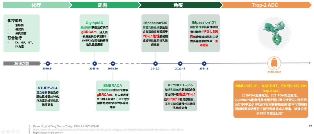 乳腺癌是女性最常见的恶性肿瘤之一。国家癌症中心最新统计数据显示,中国年新发乳腺癌病例35.72万,居女性新发恶性肿瘤第二位[1]。TNBC约占乳腺癌的15-20%[2],是预后最差的亚型[3]。晚期TNBC患者5年生存率仅12.2%[4],是其5年生存率最低的疾病阶段[5]。随着临床对TNBC的认识加深,靶向、免疫、ADC的不断发展,晚期TNBC的治疗从化疗时代走过靶向免疫时代,正式进入ADC时代,其治疗策略逐渐实现现代化。
