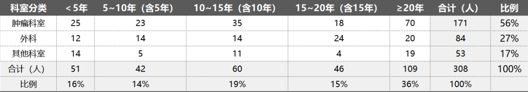 本调研所收集的308份问卷覆盖全国28个省市,204家医院,均为二级及以上医院,其中62%为三级甲等医院(2022年调研中三级甲等医院医生占比53%)。所参与调研的临床医师中,主任医师占比23%、副主任医师占比25%、主治医师占比40%;有83%的调研对象为肿瘤相关科室医生(2022年调研肿瘤科医生占比63%),其余为非肿瘤专科相关医生;36%为临床资深人员(2022年该数据为29%)——临床工作超过20年,48%参与临床工作超过5年,其余医生参与临床工作在5年以内。可见,所纳入的调研的医生包含各个层级,专业性较强,临床资历丰富,能真实反馈我国CIA管理现状。